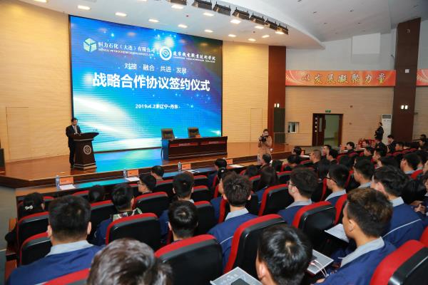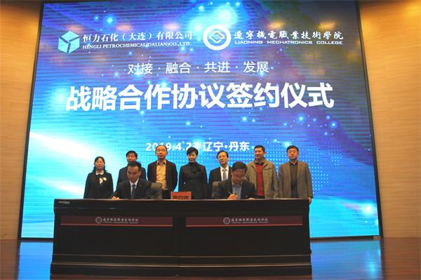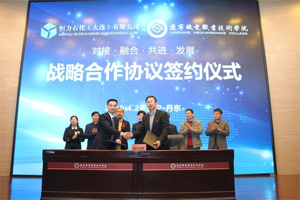 云顶集团4118com党委书记王忠诚、恒力石化(大连)有限公司副总经理叶芳礼共同签署了战略合作协议。恒力石化人事部经理韩玲、学院党委副书记陈秋鹏及相关与会领导监签。