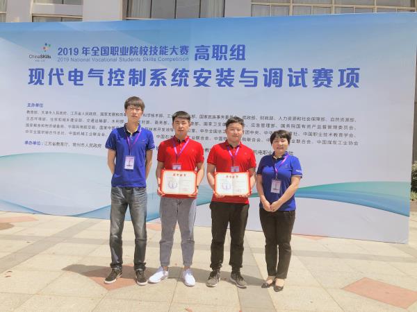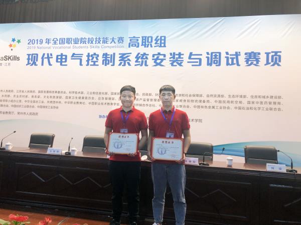 2019年全国职业院校技能大赛现代电气控制系统安装与调试赛项,于5月18日-5月19日在常州机电职业技术学院举行,来自全国31个省、市、自治区的104支代表队参加比赛。我院自动控制工程系教师石敬波、王奕飞指导的学生吴凡、王俊博组成的代表队首次参加比赛。比赛过程中,我院两名参赛选手,面对经验不足,现场突发状况,设备故障等问题,沉着冷静,灵活应对,坚持不懈,最终荣获2019年全国职业院校技能大赛现代电气控制系统安装与调试赛项三等奖。
