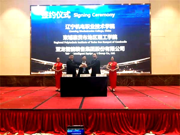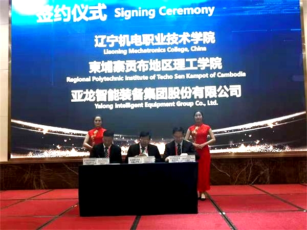 云顶集团4118com党委书记王忠诚、柬埔寨贡布地区理工学院院长克容.金朗、亚龙智能装备集团股份有限公司董事长陈继权分别代表各方签署合作协议