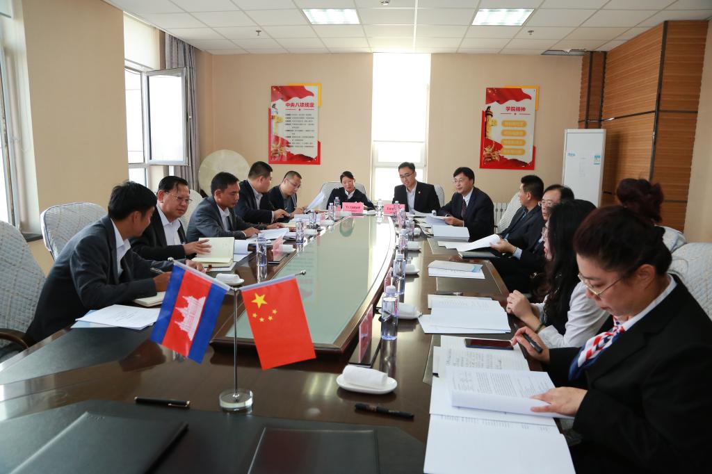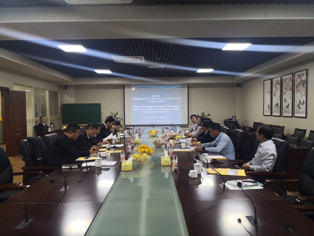 为了深度融入共建“一带一路”,建设开放合作新高地,促进中柬两国人才培养及交流,加快推进柬埔寨云顶集团4118com亚龙丝路学院建设,建成我院第一所海外分校。2019年10月23日下午,柬埔寨贡布地区理工学院、亚龙智能装备集团股份有限公司和云顶集团4118com三方在我院行政中心902会议室举行了中柬职业教育人才培养研讨会暨柬埔寨云顶集团4118com亚龙丝路学院建设工作会议。柬埔寨贡布地区理工学院院长克容·金朗、副校长蔡·卓男、行政办公室副主任本·萨姆洛特,亚龙智能装备集团股份有限公司区域总经理毛卫祥、办公室主任徐伟东,我院党委书记王忠诚、副院长赵景晖及外事办、自控系、基础部等部门领导出席了会议。