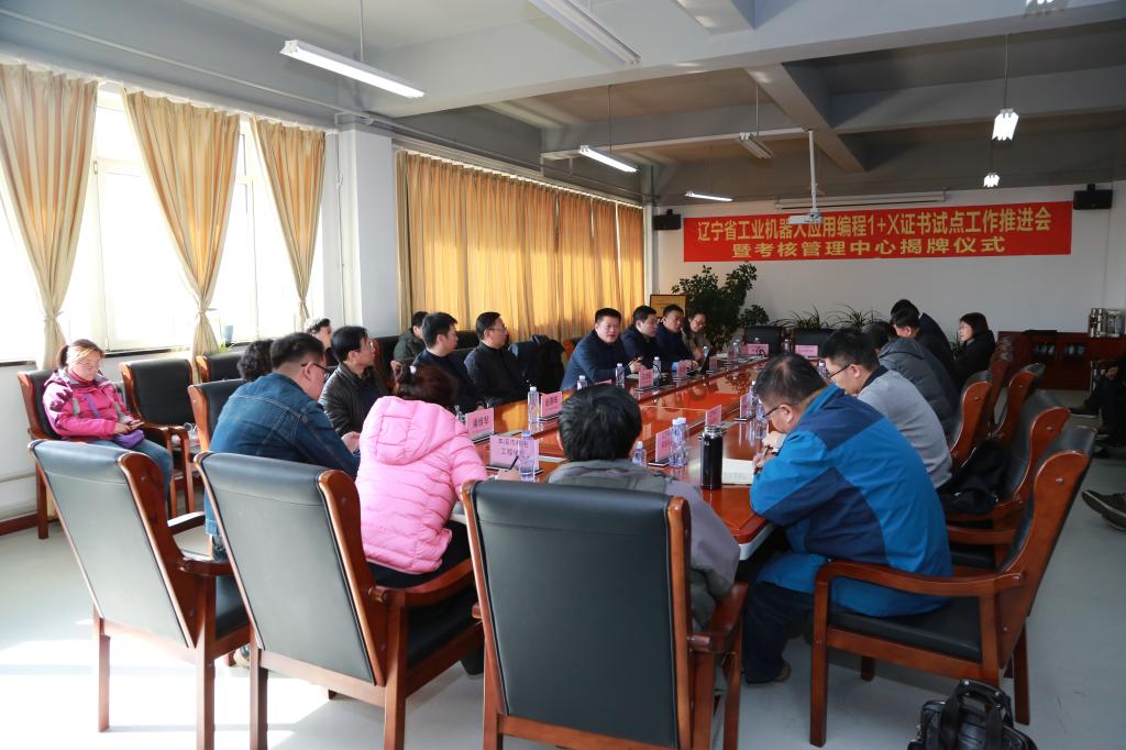 首先与会领导为北京赛育达科教有限责任公司-云顶集团4118com“工业机器人应用编程”职业技能等级证书考核管理中心揭牌,该考核管理中心是工业机器人应用编程1+X证书全国第一个揭牌成立的省级考核管理中心,承担着组织评价机构与辽宁省试点院校的沟通和部分管理工作,中心揭牌是辽宁省推进该证书试点工作的重要一步。