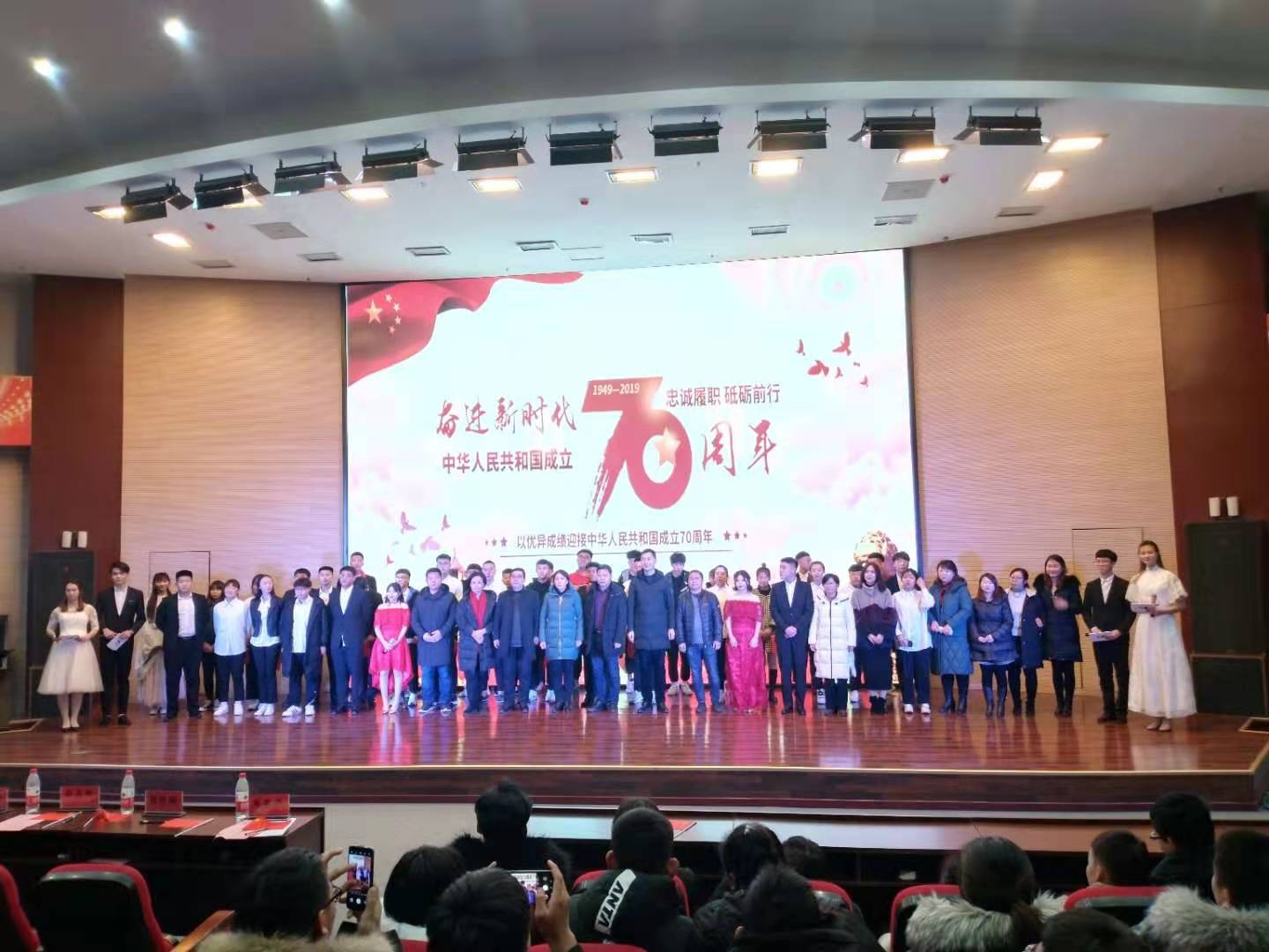为庆祝中华人民共和国成立70周年,讴歌伟大祖国所取得的辉煌成就,培育和践行社会主义核心价值观,激发广大教师爱国爱党的热情。由思政部主办,学生处、宣传部、团委、就业办、安保部、双创学院、大学生素质中心协办的庆祝“中华人民共和国成立70周年”文艺演出于2019年12月6日晚6点在大学生素质中心学术报告厅拉开帷幕。文艺汇演共15个节目,包括大合唱《走向复兴》、歌曲《我和我的祖国》、舞蹈《俯仰河山》、演讲《我的祖国》……涵盖爱国歌曲、舞蹈、演讲、朗诵、情景剧等等。