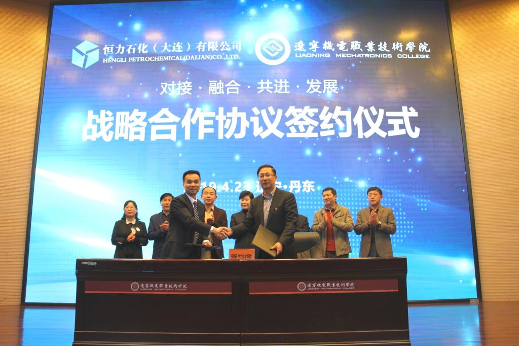 4月23日,学院与恒力石化(大连)有限公司举行了战略合作协议签约仪式,标志着学院与恒力石化(大连)有限公司校企深度融合,共建产教融合生产性实训基地,共同开展现代学徒制人才培养等工作正式启动。