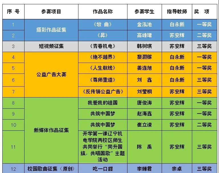 本次辽宁省大学生网络文化节活动包括短视频作品征集、微电影大赛、摄影大赛、动漫作品创作大赛等12项活动。自活动在校内开展以来,各承办部门高度重视,特别是学院团委和信息工程系,积极组织教师、学生备赛并按要求申报作品。历时5个月,在校内共征集各项作品210多项,推荐到辽宁省大学生网络文化节作品17项,有12项获奖。
