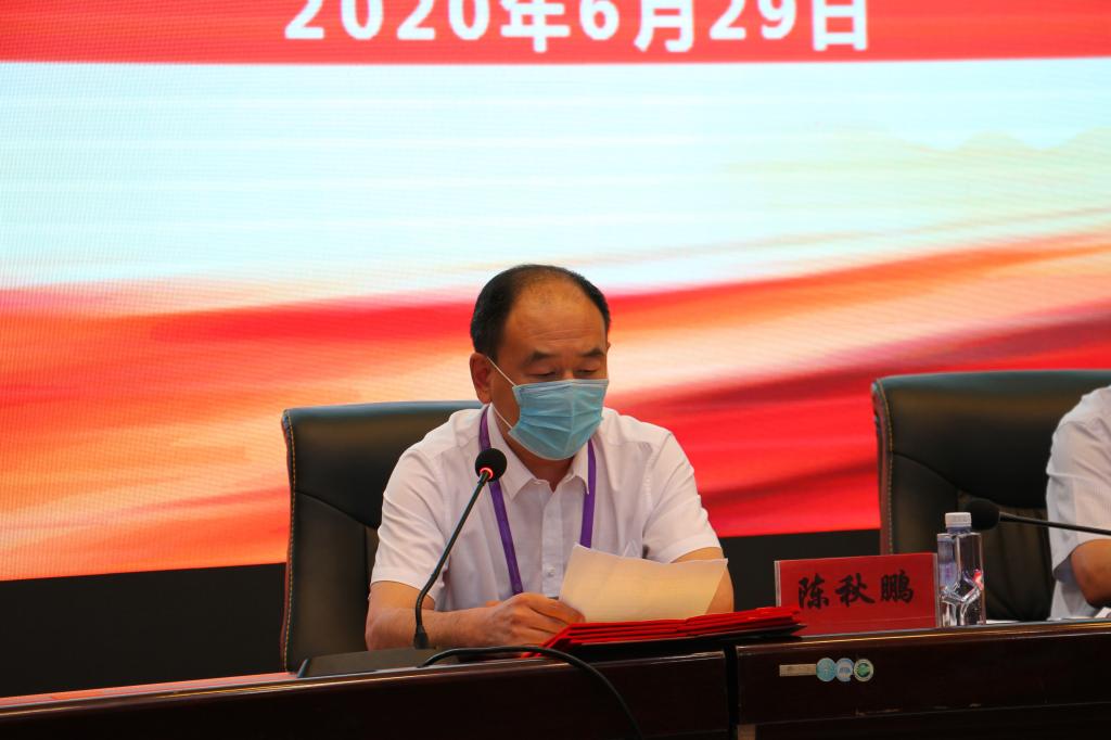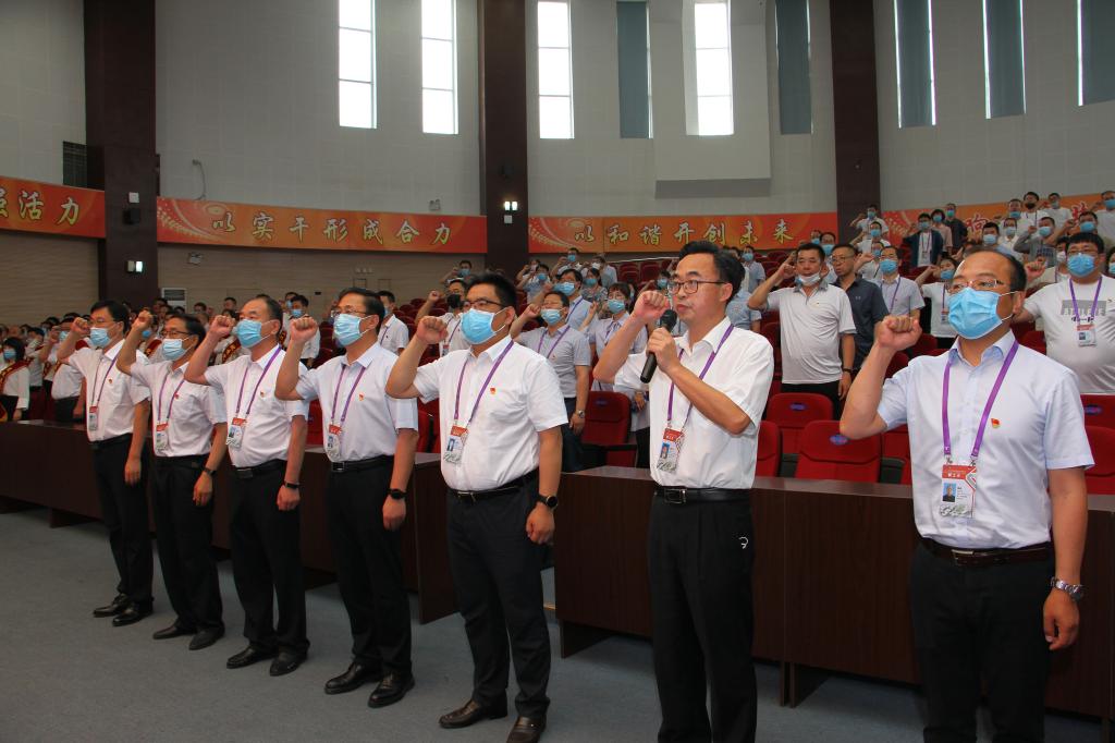 大会在全场奏唱国歌声中拉开帷幕。在党委委员、组织人事部部长宁秋平的带领下,全体党员庄严地重温了入党誓词。党委副书记陈秋鹏宣读了《关于表彰2019-2020年度“两先三优”的决定》,主席台就座的党委委员为获得先进党总支、先进党支部、优秀共产党员、优秀党务工作者称号的单位和个人颁发奖牌和证书。