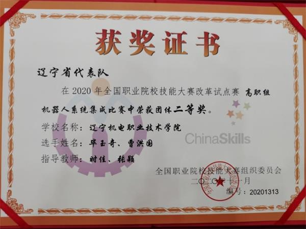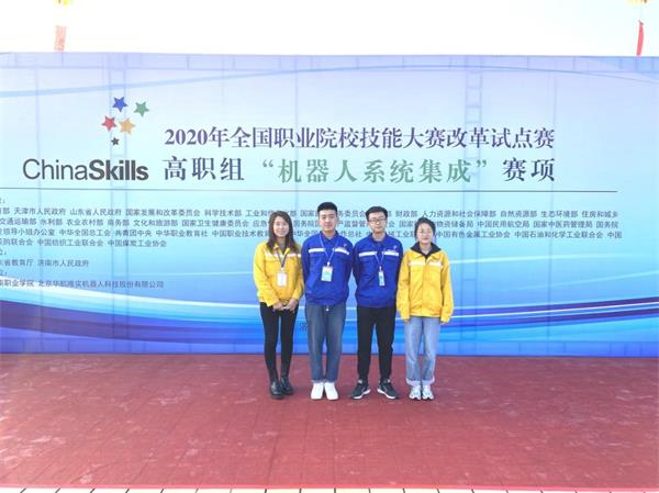 11月20日,2020年全国职业院校技能大赛改革试点赛“机器人系统集成”赛在济南职业学院落幕。在我院自动控制工程系主任刘中华领队,教师时佳、张颖的指导下,工业机器人专业19141班曹洪国和18143班毕玉奇同学组成的参赛队,以优异成绩获得了高职组二等奖荣誉。